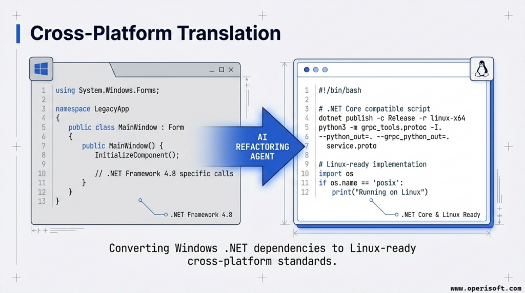 - Automated Refactoring:Β It decomposes legacy monoliths and converts Windows-bound .NET code into Linux-ready, cross-platform architecture.β
